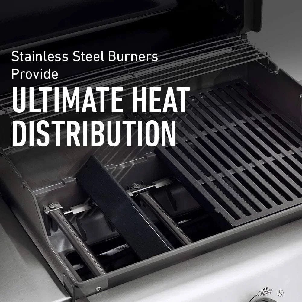 - This grill is equipped with a thermometer, a side shelf, and a removable drip tray.